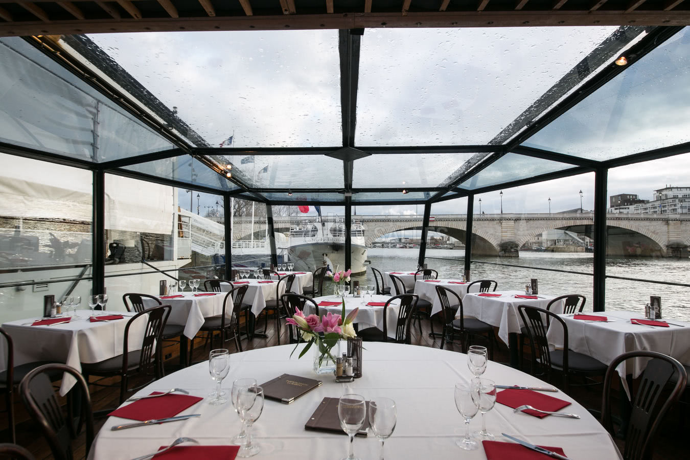 Le Vert Galant : Bateau de style « bistrot » en bois et grande fenêtre. Idéal pour des événements jusqu’à 100 personnes.