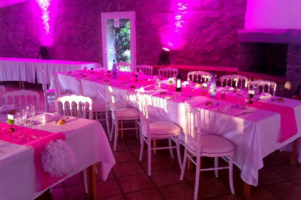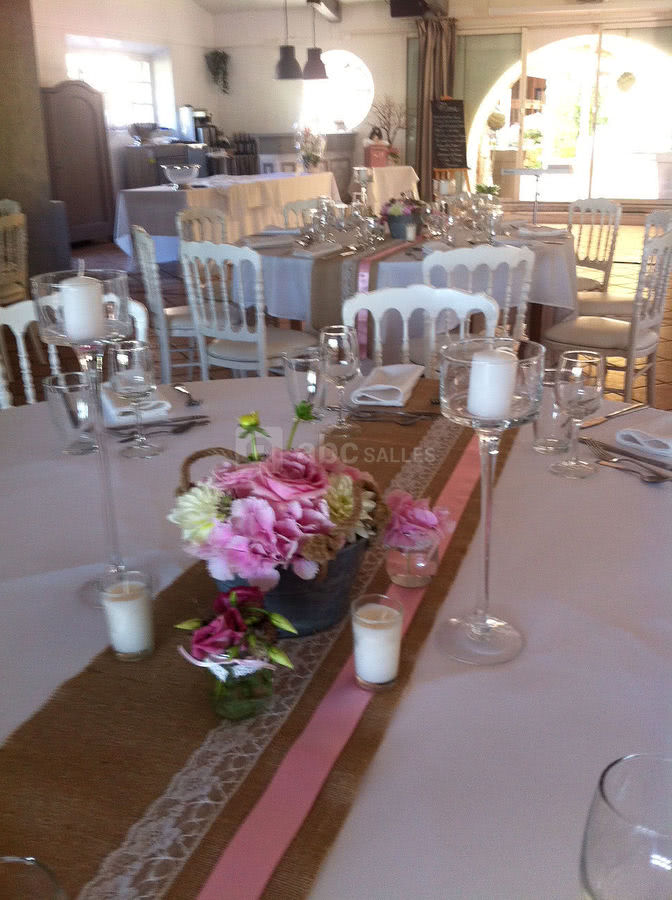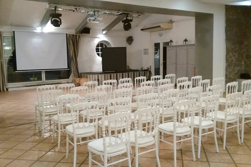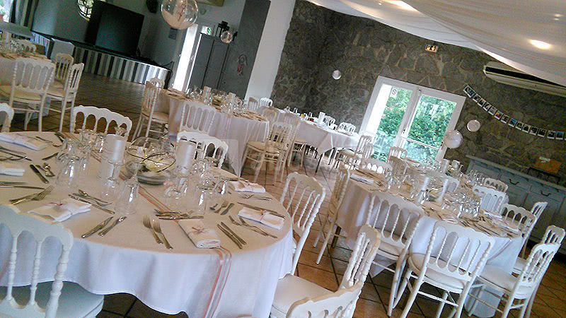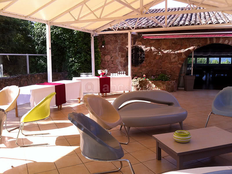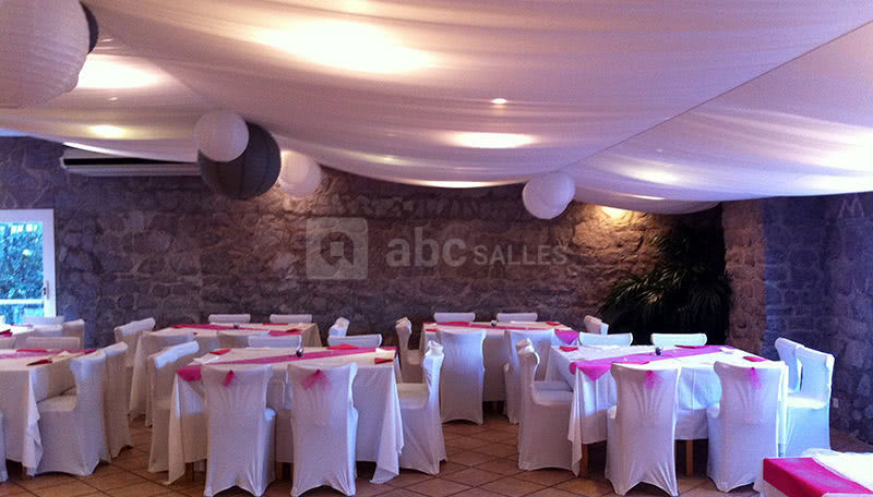 La salle du Mas des Bartavelles est toute en pierre, sans pilier et avec climatisation et peut recevoir 180 personnes assises et 150 en conservant une piste de danse. A votre disposition également une terrasse couverte de 100 m² et un jardin de plus de 150 m². A l'arrière de la salle, une esplanade de 250 m² pouvant accueillir vos cocktails ou cérémonies laïques avec une vue imprenable sur l'Esterel et un aperçu mer cette salle est également climatisée, et à la lumière du jour.