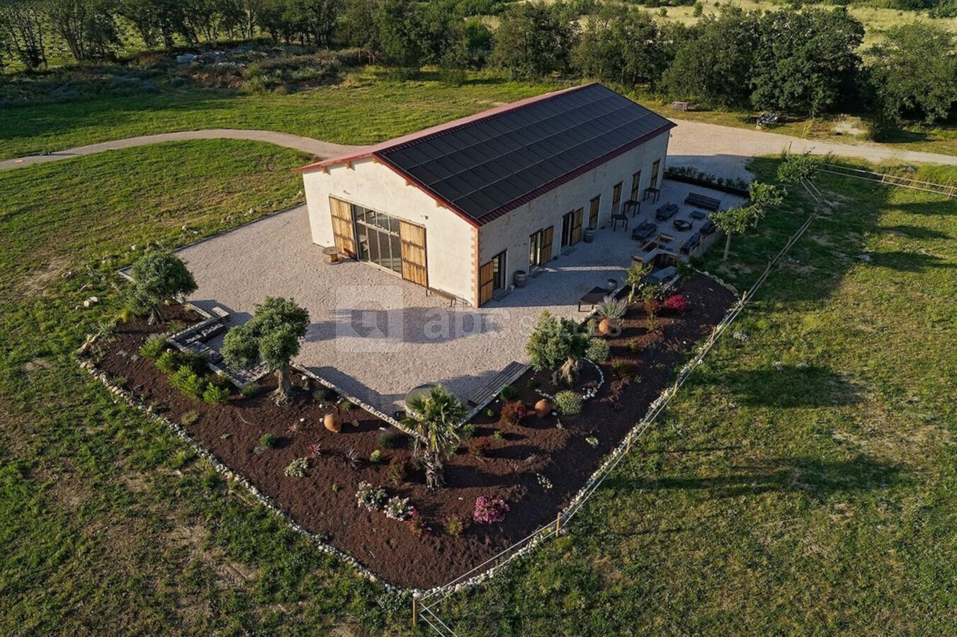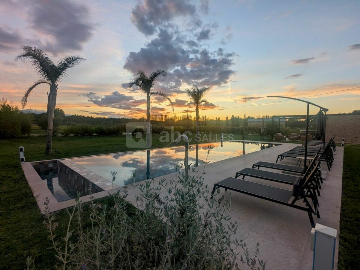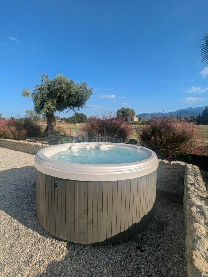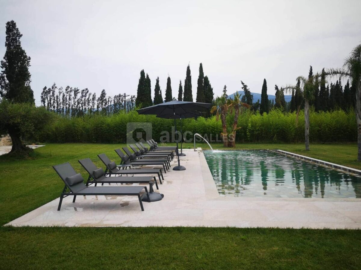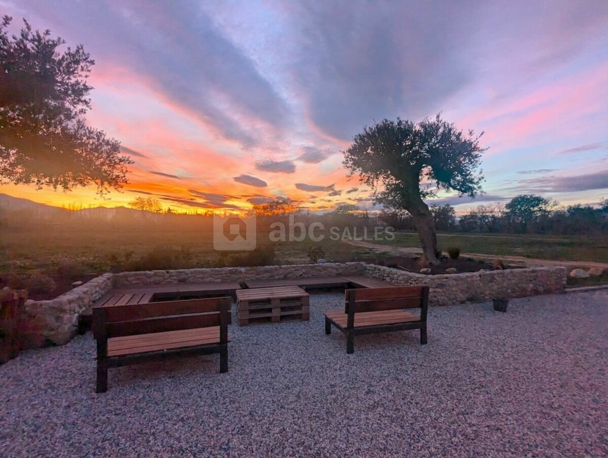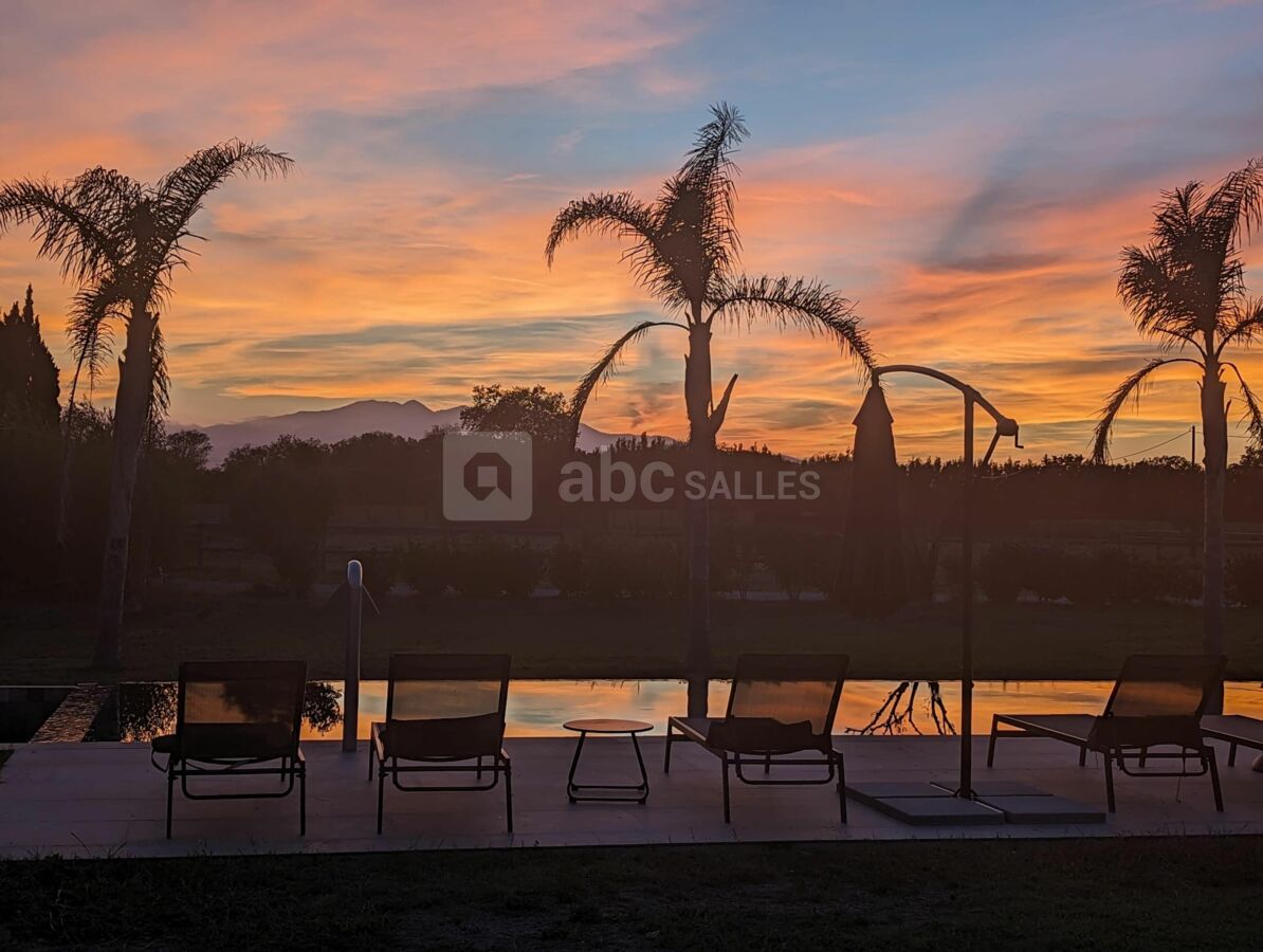 À l’extérieur, une vaste terrasse bordée d’un jardin méditerranéen, où oliviers, lavandes et essences locales se mêlent harmonieusement, constitue un cadre idéal pour les cocktails et réceptions en plein air. Niché au milieu de vergers et de prairies où évoluent paisiblement nos chevaux, le domaine est un véritable havre de sérénité, où la quiétude de la campagne s’unit à la douceur du climat catalan.