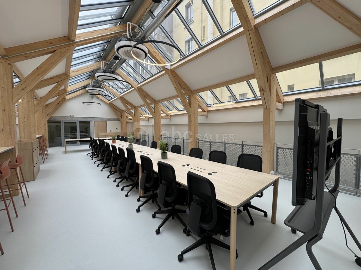 Installé dans un bâtiment de 7 niveaux, le Studio propose plusieurs espaces privatifs : grandes salles de réunion, espaces événementiels et petites salles fermées adaptées aux formats plus confidentiels. L’ensemble du lieu bénéficie d’une lumière naturelle exceptionnelle, notamment grâce à une verrière centrale qui apporte une atmosphère chaleureuse et inspirante.