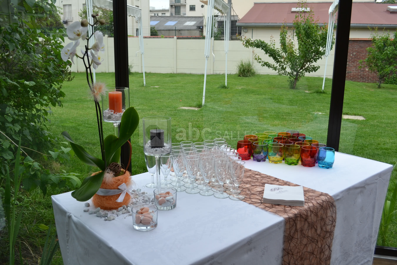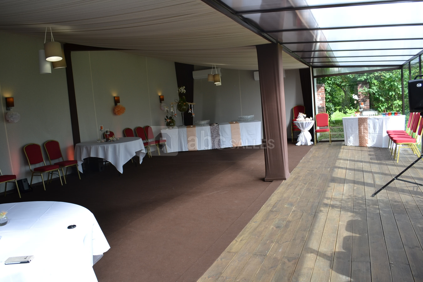 La Salle Mylène se trouve dans un espace élégant situé au coeur d'un écrin de verdure pouvant recevoir jusqu'à 120 personnes. Les murs et le plafond couverts de tissus tendu, lui donne chaleur et clarté baies vitrées ouvrant sur le jardin clos offrent à cette salle une grande luminosité pour tous vos événements d'après-midi, afin de profiter en été des délices extérieurs.