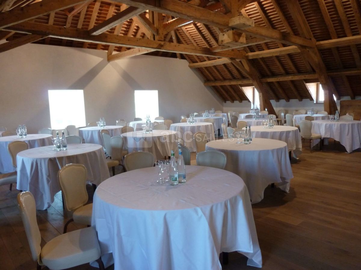La salle Dorianna, elle, est située au premier étage. Cette grande et magnifique salle dispose d’une ancienne cheminée, d’une charpente imposante, partie intégrante d’un plafond de 12 mètres de hauteur, ainsi que quatre estrades permettant des animations au coeur de l’événement. De par sa disposition, cette salle convient tant pour des soirées intimes que pour des dîners jusqu’à 300 personnes. Une cuisine professionnelle entièrement équipée est à disposition au même étage. Vestiaires avec huit WC au rez-de-chaussée.