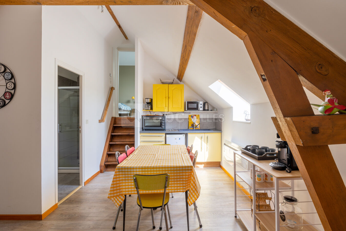 Le gîte "L’appart" a été meublé dans un esprit « home staging » années 70. Située au-dessus de la salle de réception en accès direct, il s’agit d’un appartement complet avec espace salon-TV, kitchenette, salle de bains avec WC et douche, chambre avec 2 grands lits, et 4 petits lits. Il est le complément idéal lors de vos fêtes pour offrir à vos invités ou à vous même le pied à terre le temps de la soirée. En dehors de toute réservation de la salle, il reste accessible à la location pour une "tribu" allant jusqu'à 8 personnes (lors de vos réceptions 3 matelas sans suppléments peuvent y être installés).