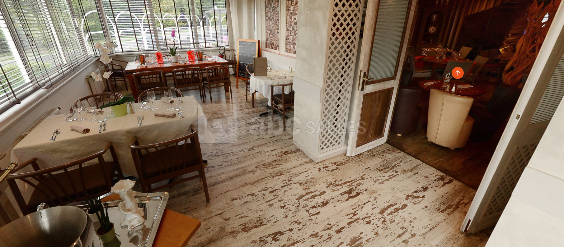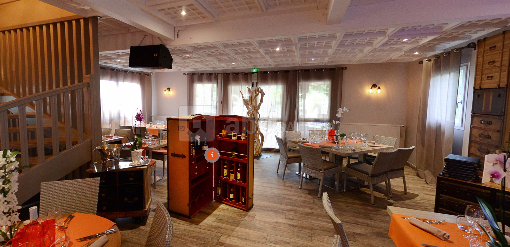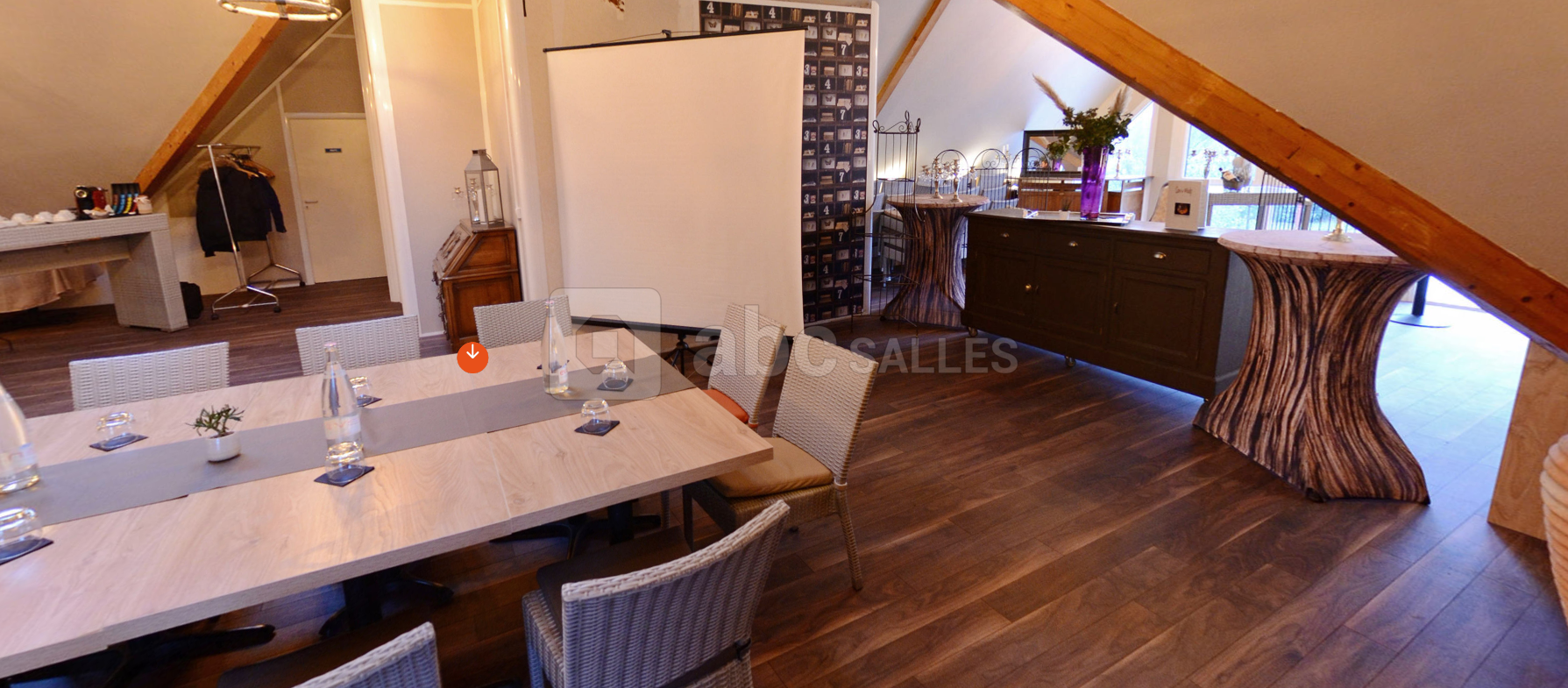 La grande salle du haut (120 m²) est climatisée et peut être divisée en 2 salles de réunions. Elle peut accueillir jusqu'à 60 personnes avec des tables et plus de 70 en disposition "salle de classe".