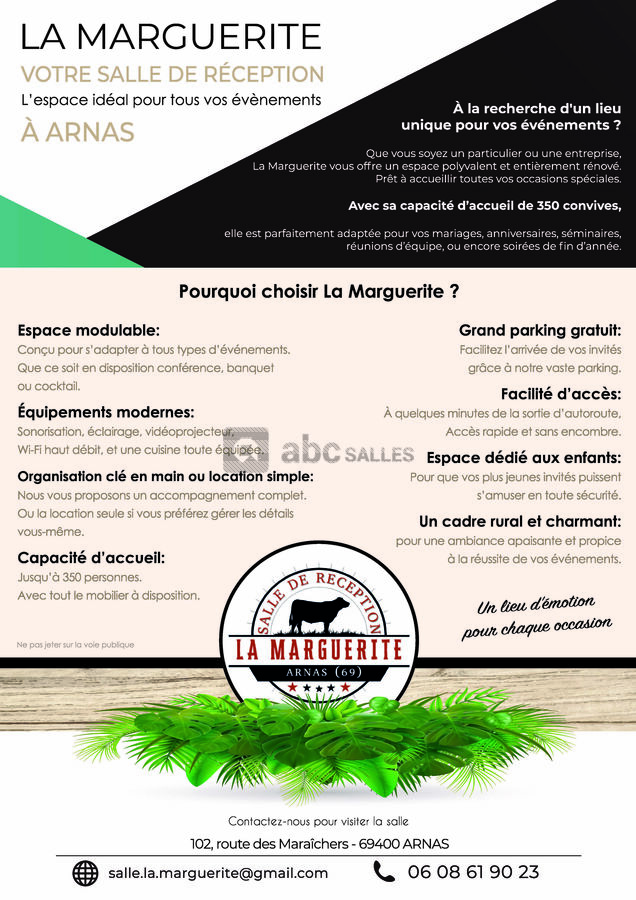 Située au cœur du Beaujolais, la Salle de Réception La Marguerite, implantée au 101 route des Maraîchers à Arnas (69400), offre un cadre chaleureux et élégant pour accueillir vos plus beaux événements. Niché dans un environnement verdoyant, l’établissement allie confort, modernité et authenticité, créant une atmosphère idéale pour se rassembler et célébrer.