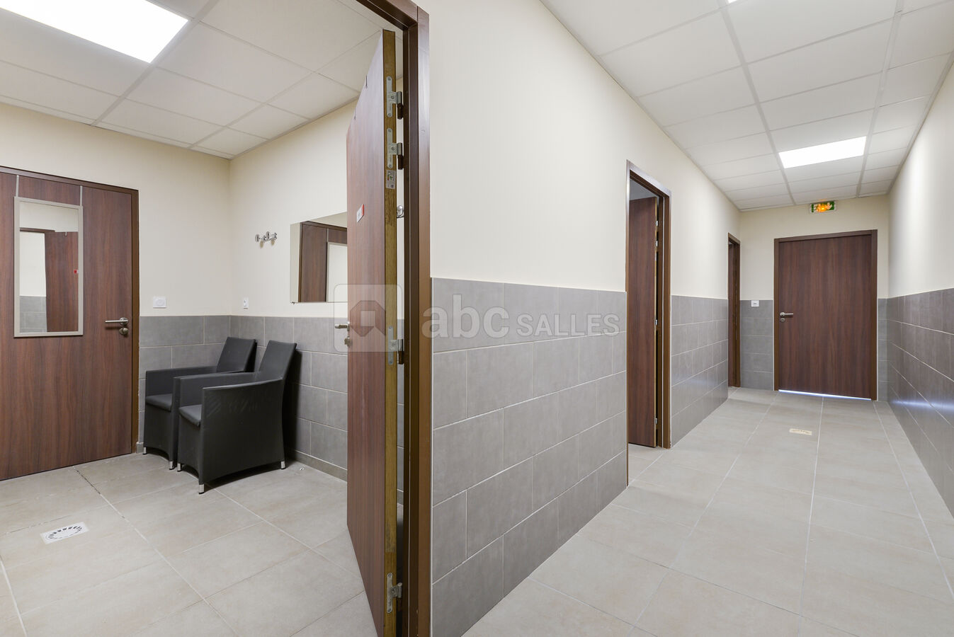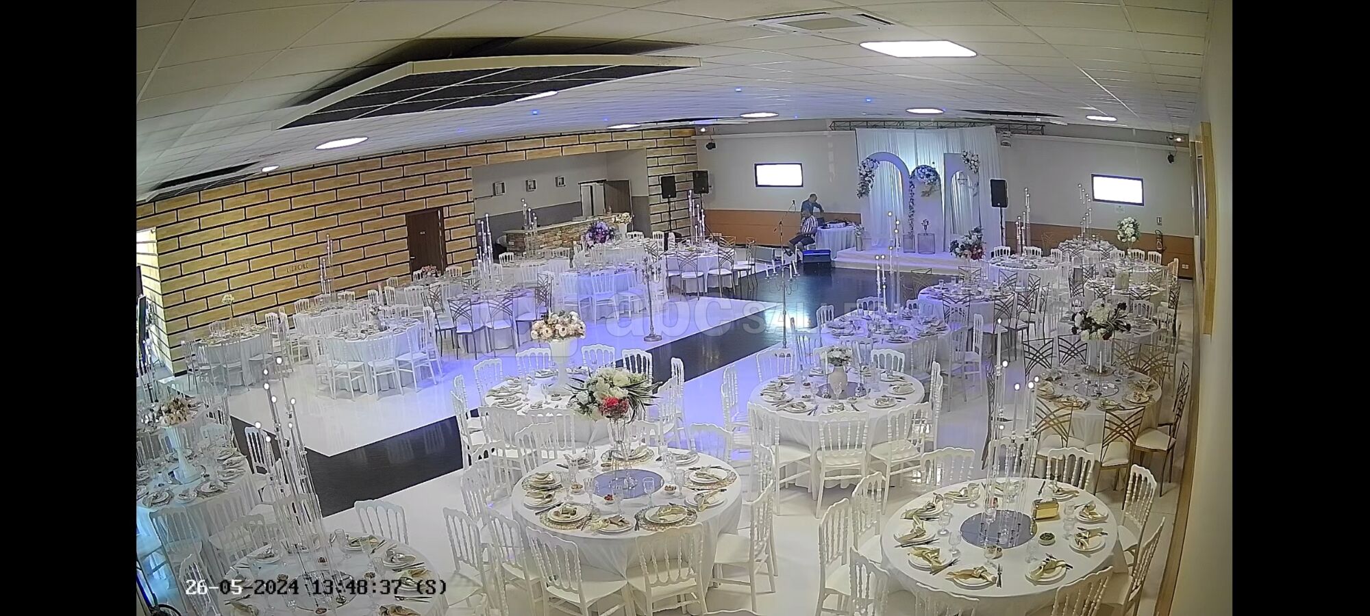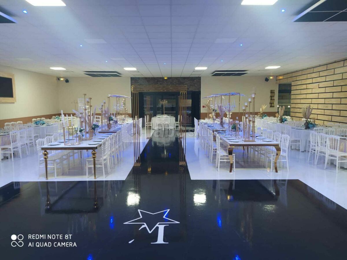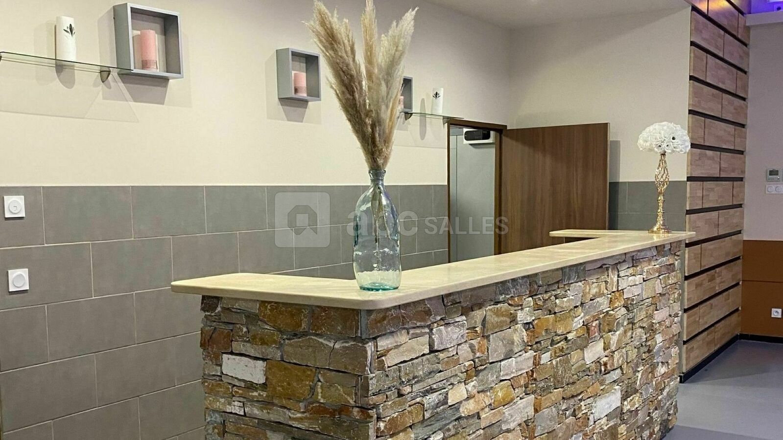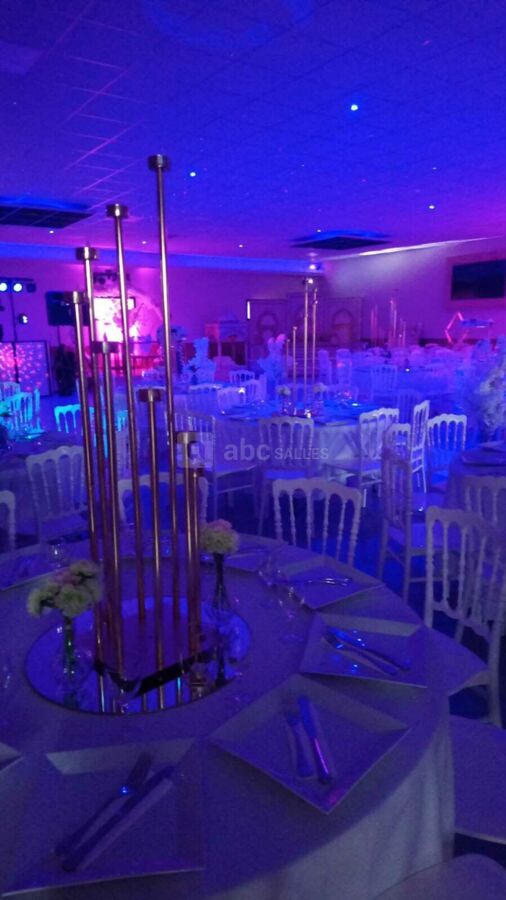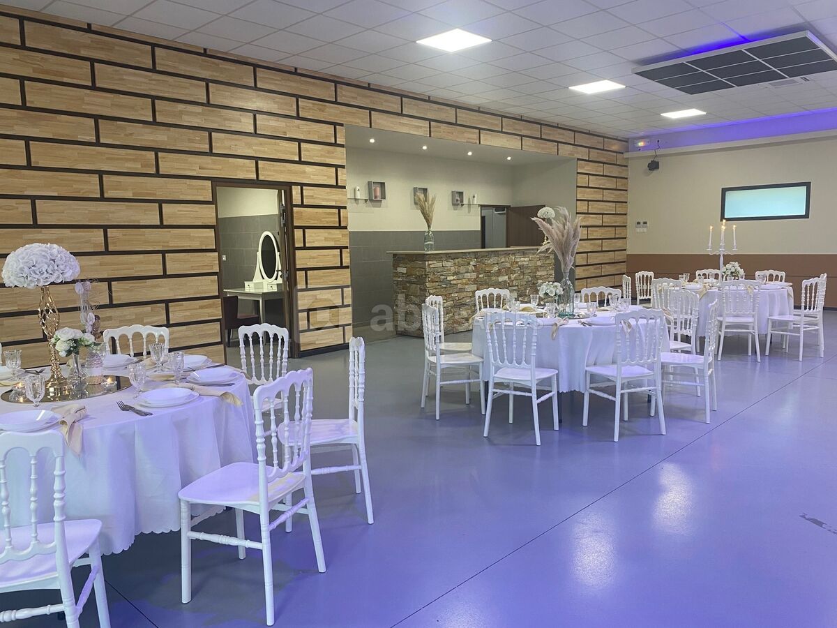 Salle moderne et chaleureuse équipée d'un patio de 100 m², d'une grande terrasse, d'une cuisine avec très grande chambre réfrigérée, d'une loge, de jeux de lumière, d'un parking intérieur (35 véhicules) avec possibilité de se garer à l'extérieur, d'une rampe accès personnes handicapés.