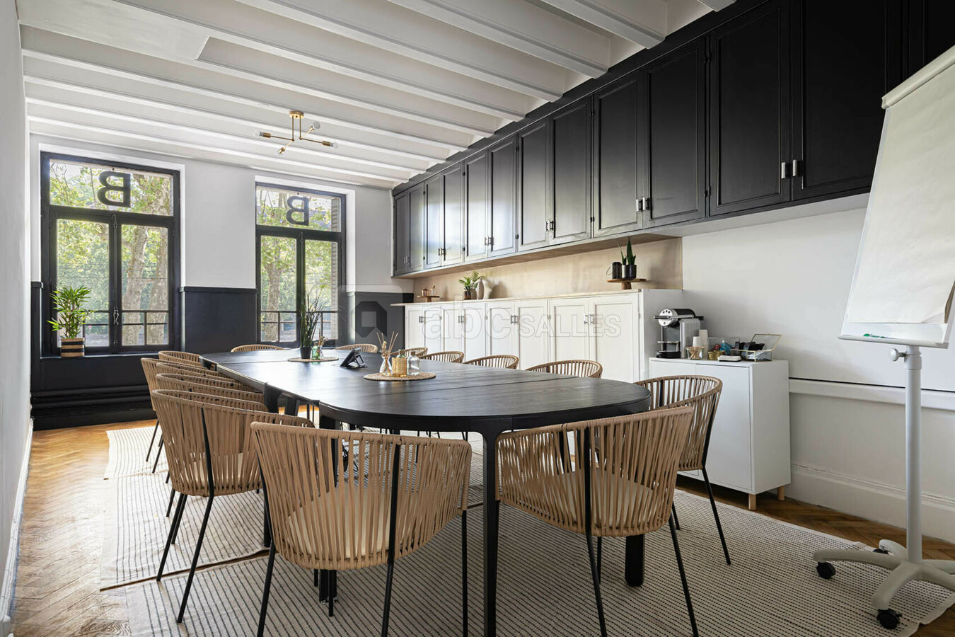 Le Studio 33 se compose de trois espaces distincts : le Showroom, un vaste espace principal de 120 m², idéal pour des séminaires, des soirées cocktails ou des animations, et à l'étage, deux autres espaces : l'Atelier et la Bibliothèque, parfaits pour des événements en petit comité, réunions, moments informels.